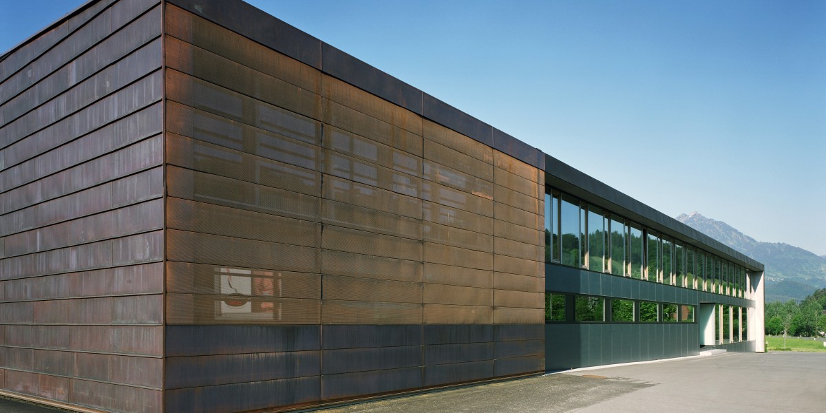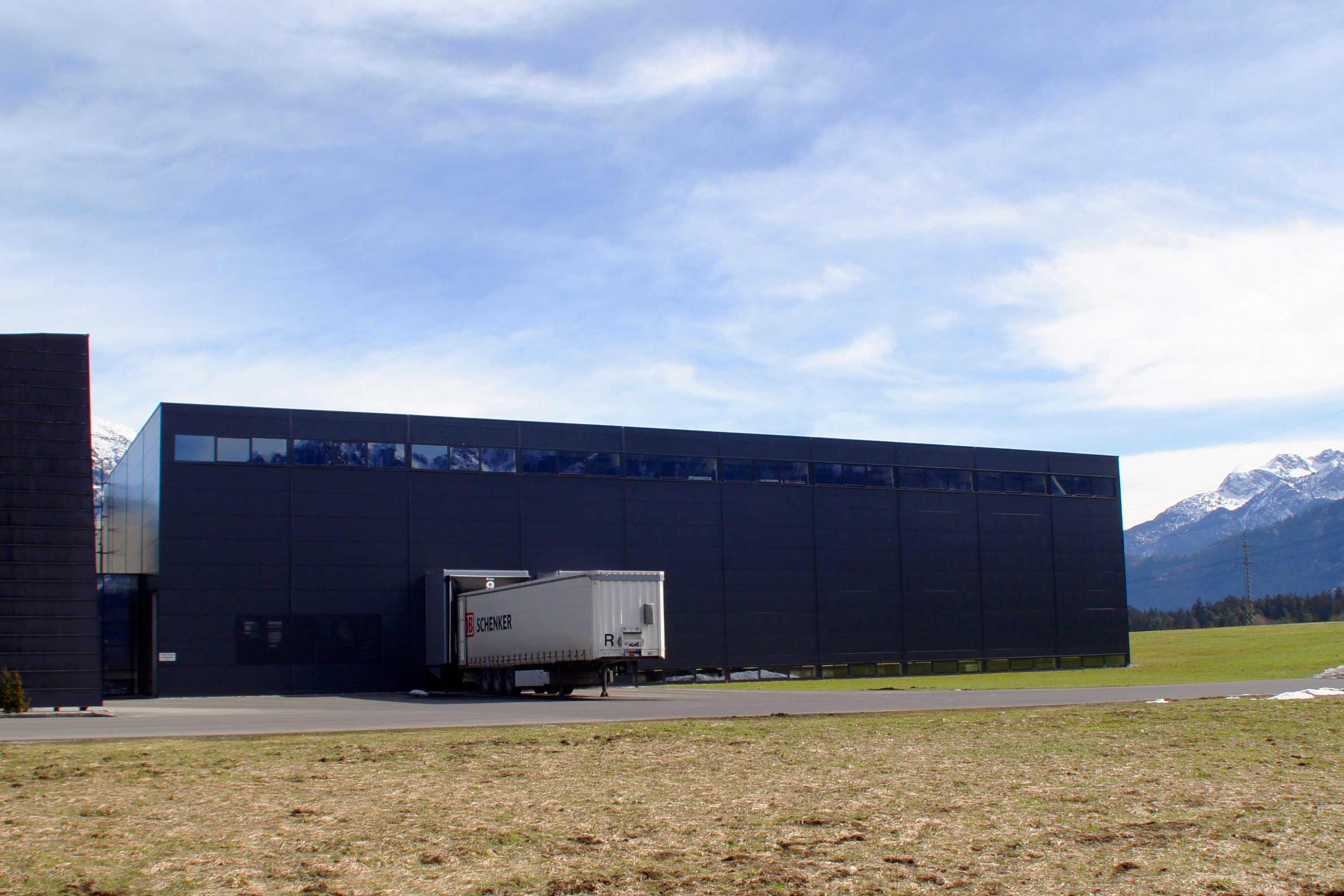 Südseitig wurde als 3. Bauetappe ein Lagergebäude in zurückhaltend dunkler Fassadenfarbe realisiert.