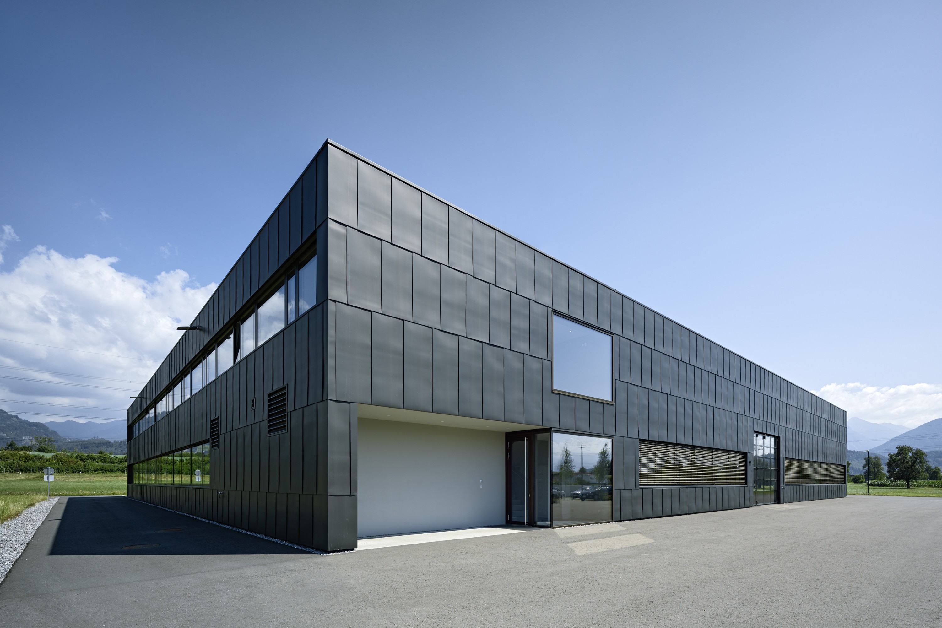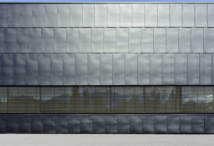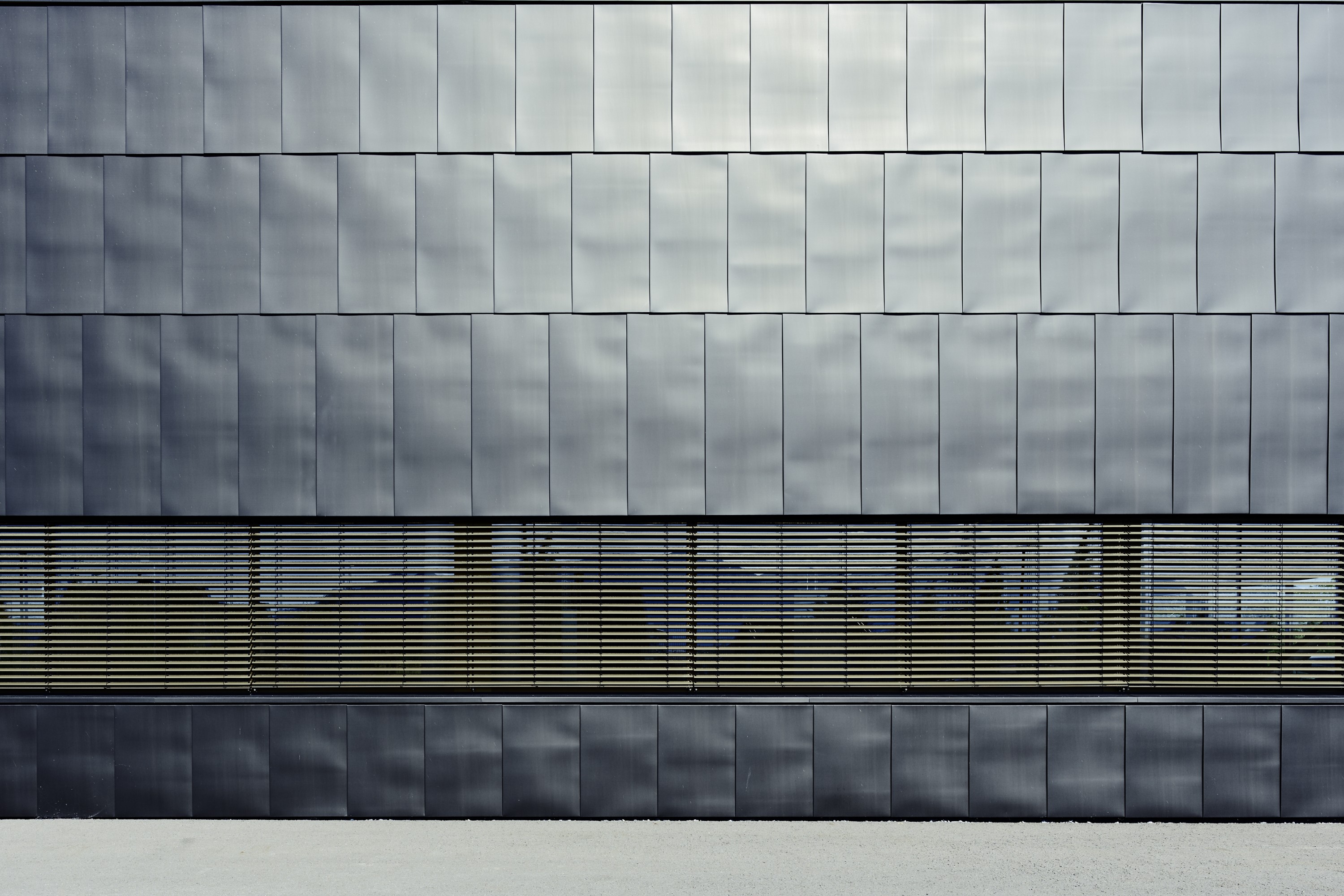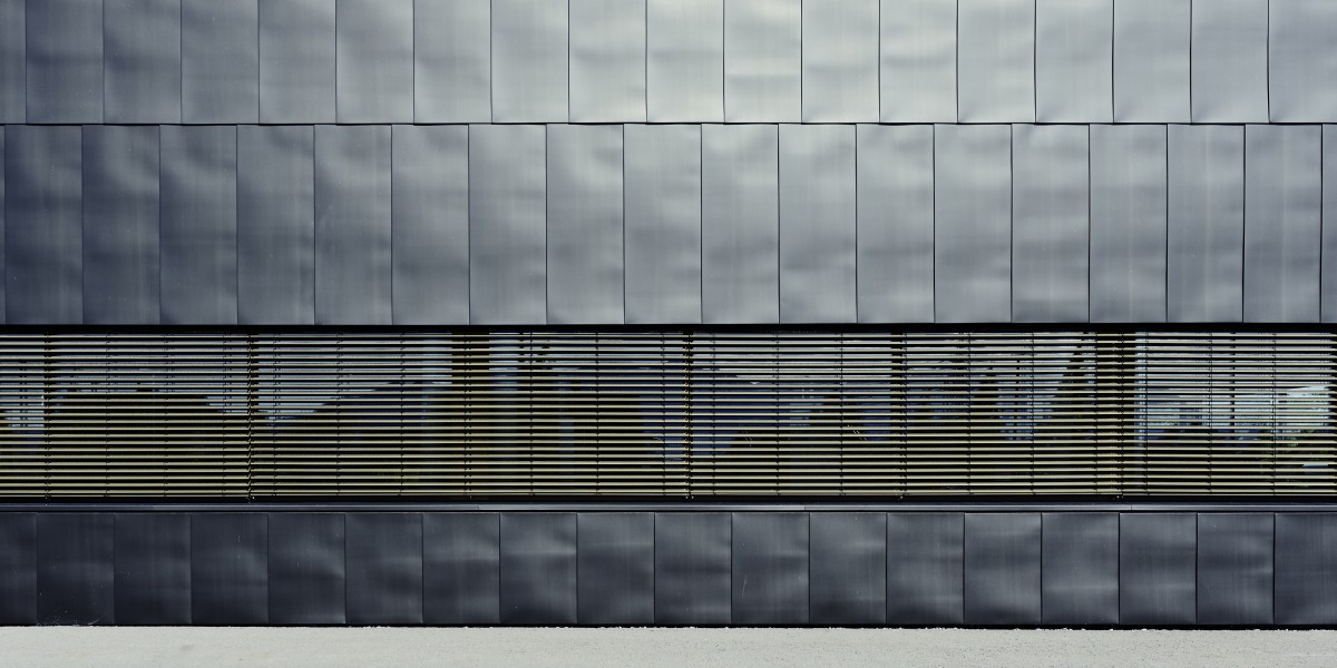 Der gesamte Neubau ist mit einer Fassadenhaut aus schwarz patiniertem Zinkblech in Großformat-Rauten umhüllt.
