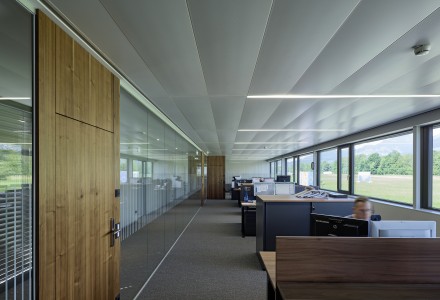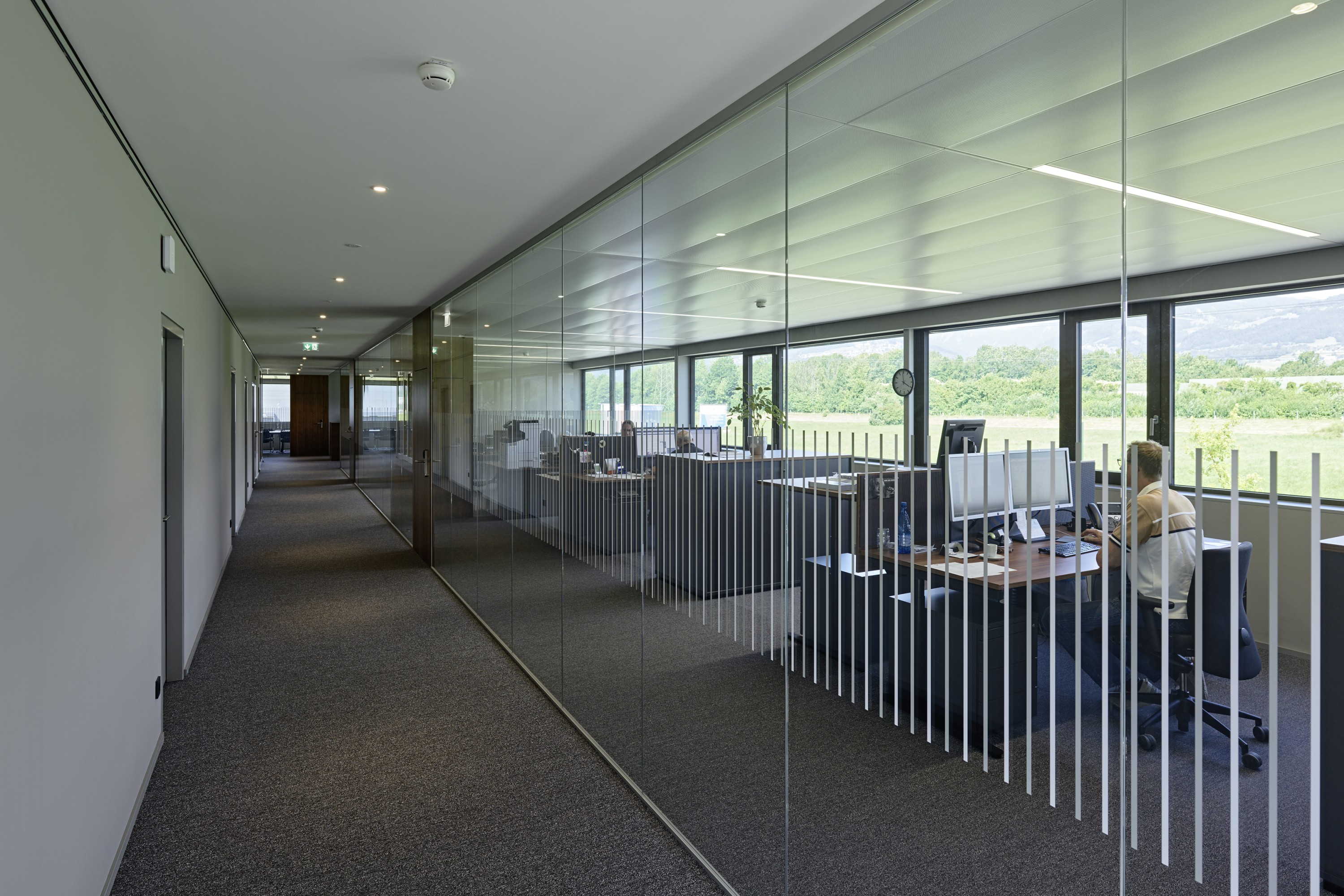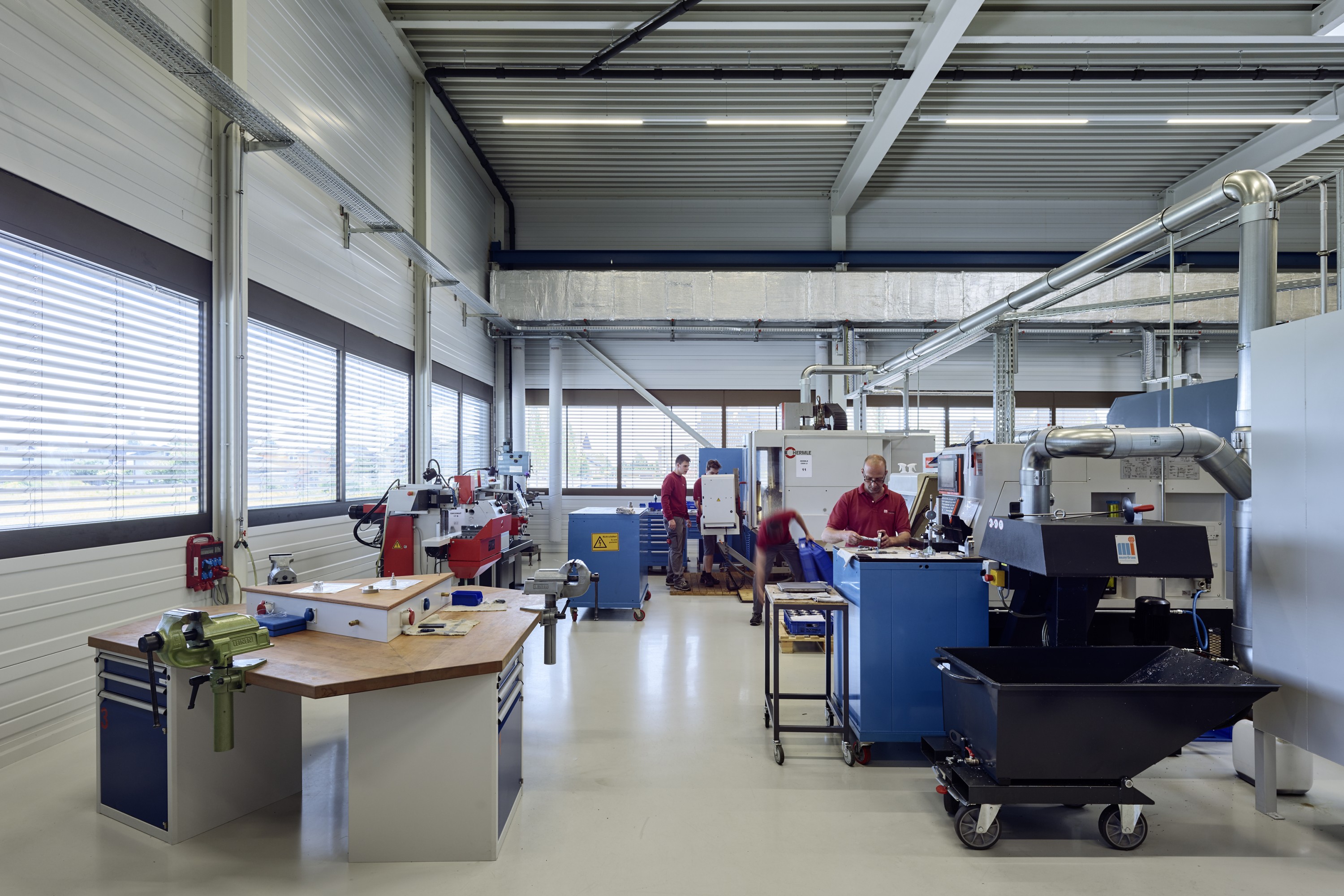 Die neue Firmenzentrale zeigt sich als schlichtes aber repräsentatives Gebäude. Die unterschiedlichen Bereiche wie Technische Entwicklung, Produktion und Verwaltung sind ohne Hierarchie in EINEM Haus mit einer gemeinsamen Identität auf mehreren Ebenen untergebracht.